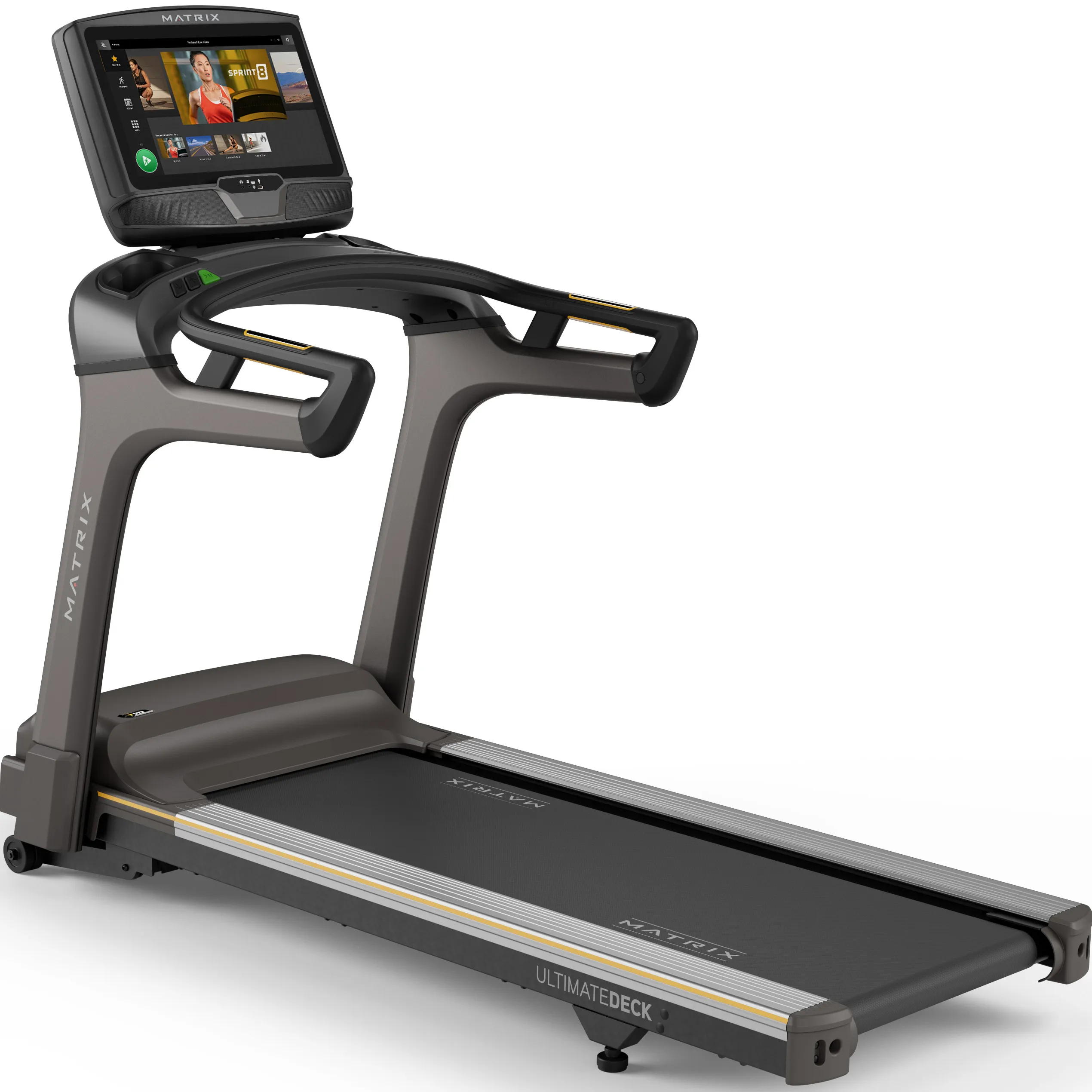 большой HD дисплей, просторное беговое полотно, быстрые сенсорные клавиши управления, держатели для бутылок, подставка для девайсов, датчики пульса, аллюминиевые направляющие, мощный мотор полупрофессионального класса