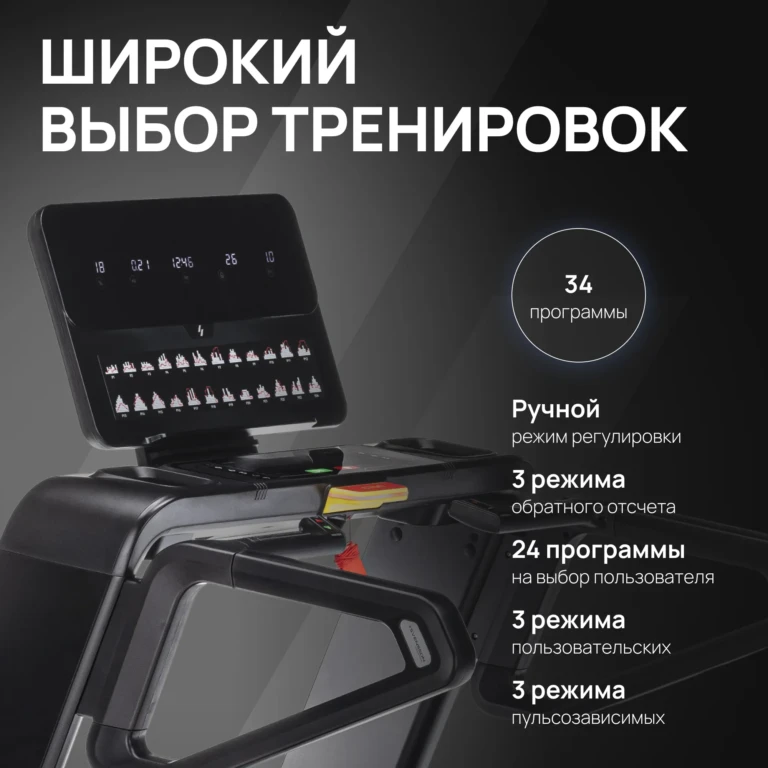 ручной режим, 3 режима обратного отсчета, 24 программы + 3 пользовательских + 3 пульсозависимые