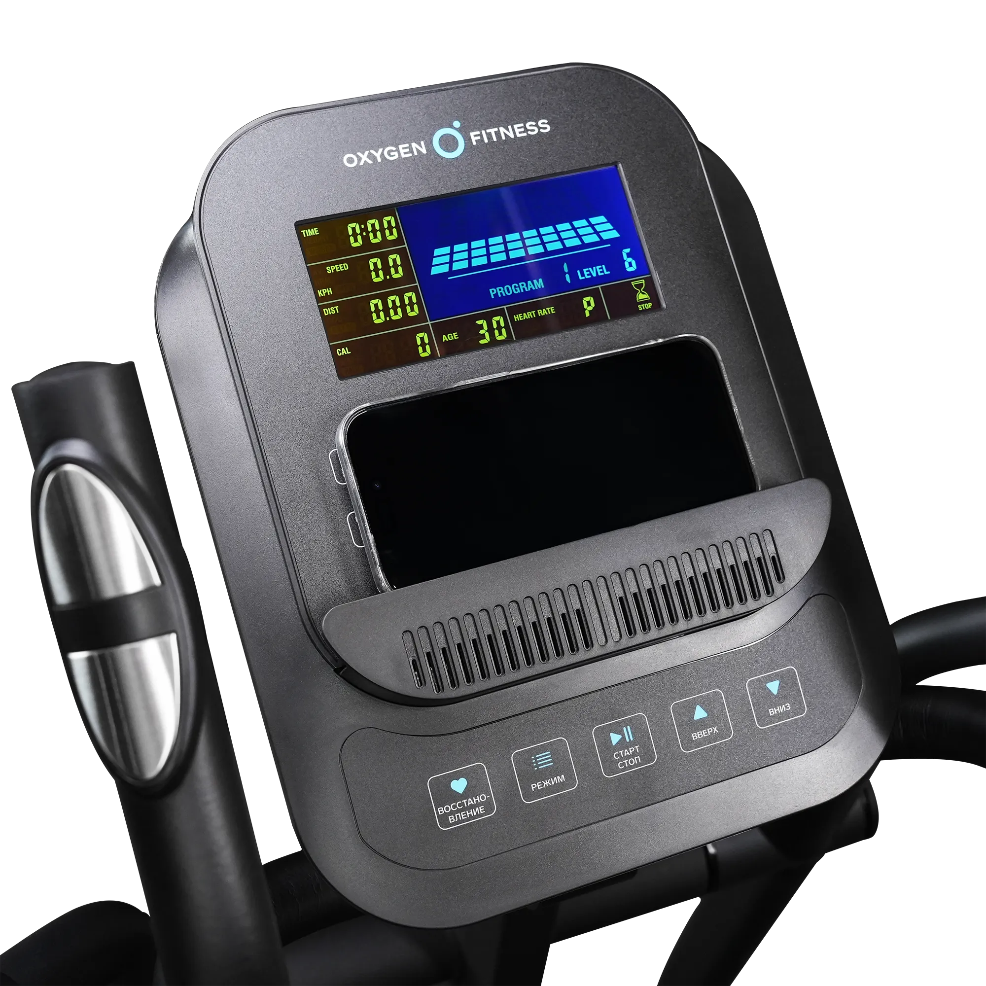 время, скорость, дистанция, калории, пульс, уровень нагрузки, программа, статус Bluetooth