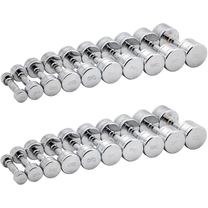 Комплект включает 10 пар гантелей с шагом в 1 кг, от 1 до 10 кг, что позволяет точно подобрать нагрузку для любого упражнения. Общий вес набора – 110 кг. Эргономичные хромированные рукояти (диаметр 28 мм, длина 120 мм) гарантируют надёжный хват, предотвращая скольжение и обеспечивая максимальный комфорт и безопасность во время занятий.