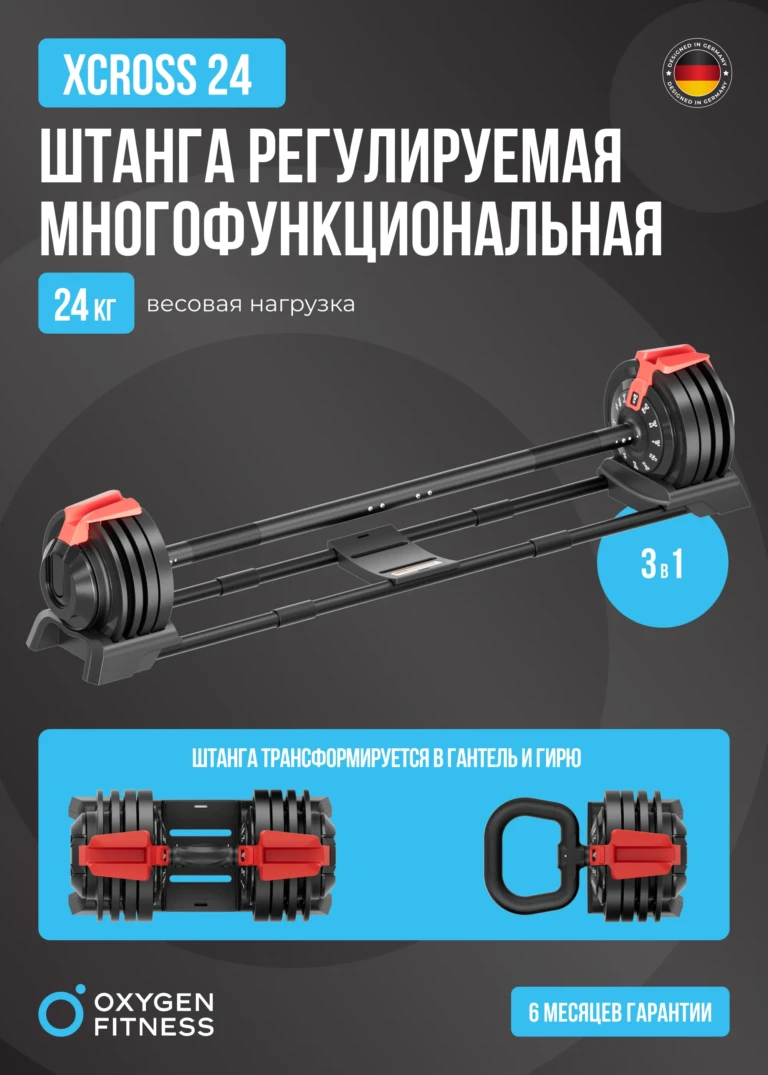 Представляем Штангу регулируемую многофункциональную 3 в 1 OXYGEN FITNESS XCROSS 24 кг – идеальное решение для эффективных тренировок дома или в коммерческом зале. Этот инновационный тренажёр от Oxygen Fitness, изготовленный из прочной стали, объединяет в себе универсальность, надёжность и безопасность. Забудьте о множестве отдельных снарядов: XCROSS 24 кг даёт вам широкий спектр возможностей для силовых упражнений в одном компактном устройстве.
