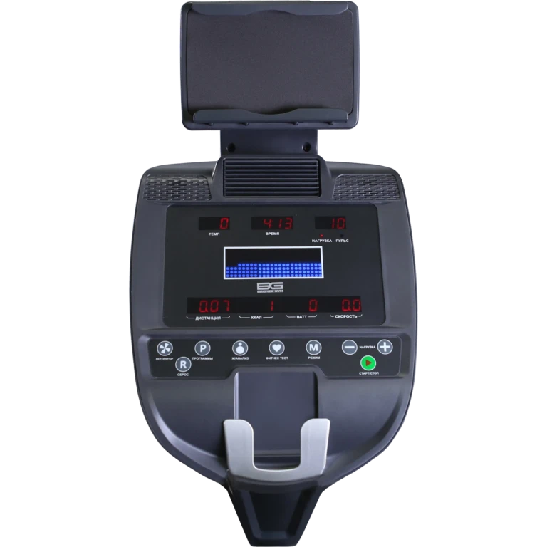 Электромагнитная система с 20 уровнями нагрузки и 15-килограммовым маховиком обеспечивает плавный, тихий ход. Многофункциональный LED-дисплей с русским интерфейсом предлагает 20 программ, включая пульсозависимые, пользовательские и аудиовоспроизведение через динамики.
